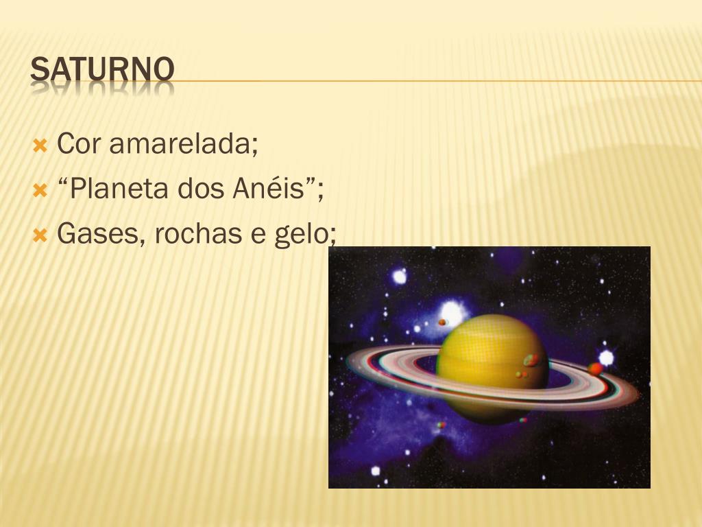Cor amarelada; “Planeta dos Anéis”; Gases, rochas e gelo; saturno