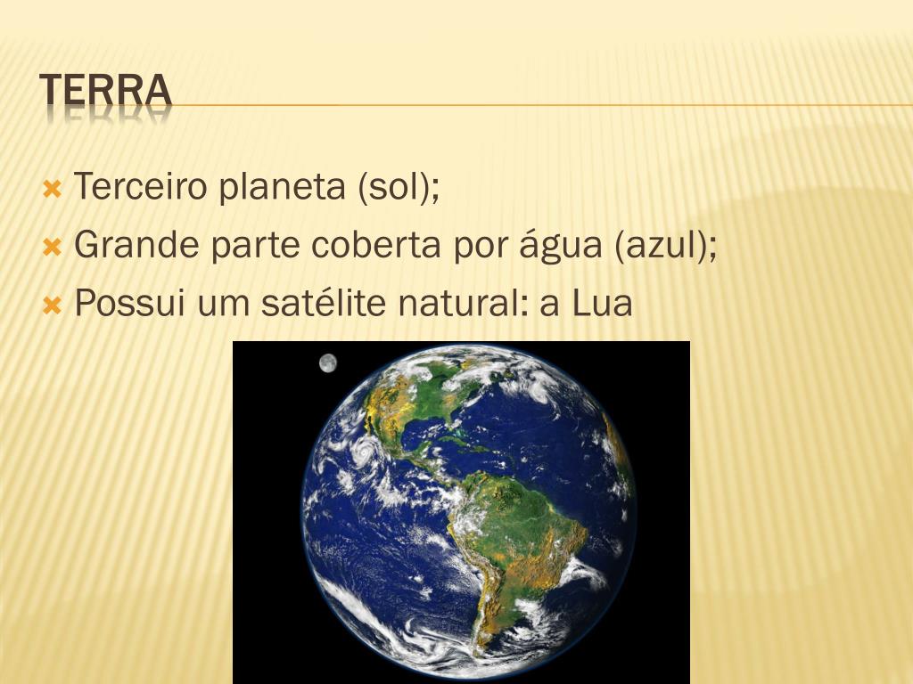 Terceiro planeta (sol); Grande parte coberta por água (azul); Possui um satélite natural: a Lua terra