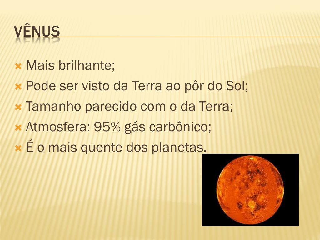 Mais brilhante; Pode ser visto da Terra ao pôr do Sol; Tamanho parecido com o da Terra; Atmosfera: 95% gás carbônico; É o mais quente dos planetas. vênus