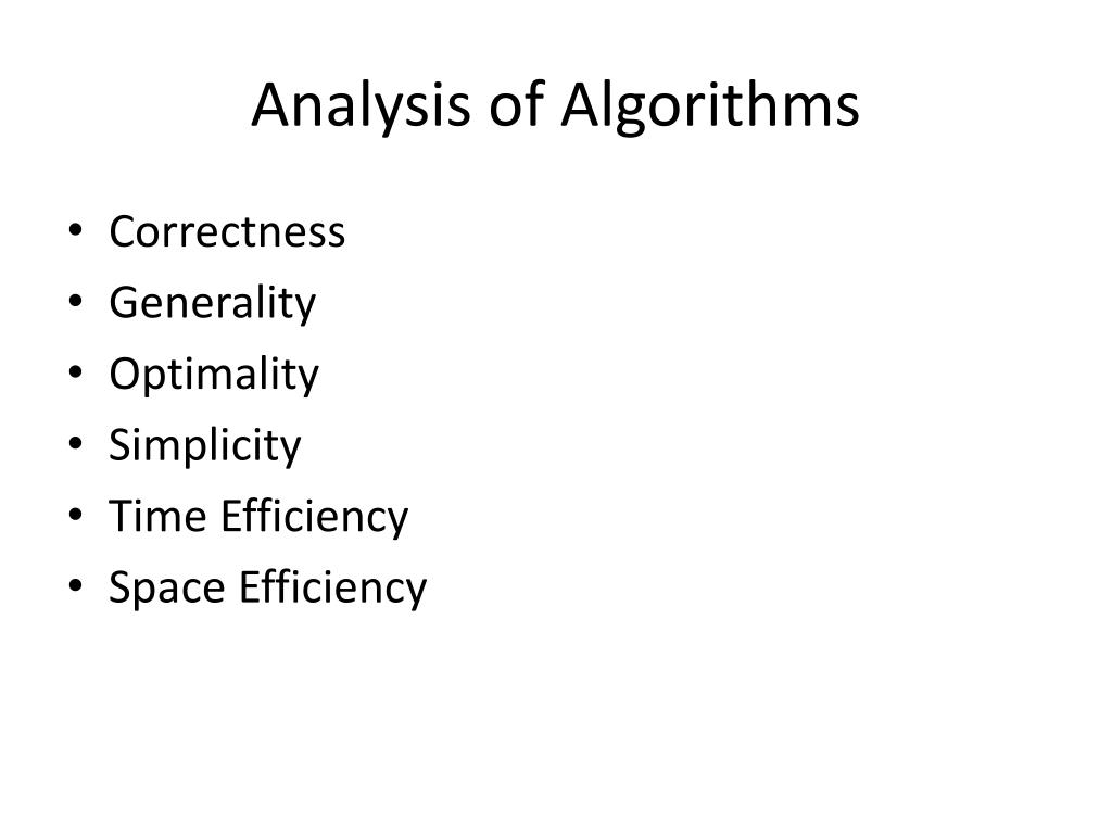 Analysis of Algorithms • Correctness • Generality • Optimality • Simplicity • Time Efficiency • Space Efficiency