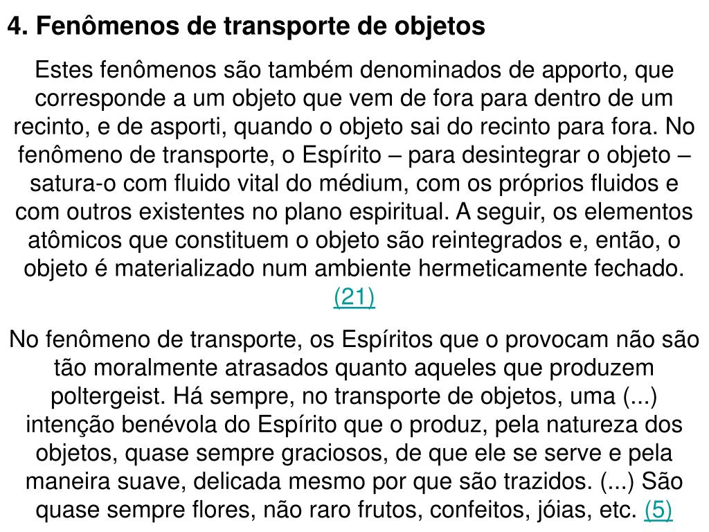 4. Fenômenos de transporte de objetos Estes fenômenos são também denominados de apporto, que corresponde a um objeto que vem de fora para dentro de um recinto, e de asporti, quando o objeto sai do recinto para fora. No fenômeno de transporte, o Espírito – para desintegrar o objeto – satura-o com fluido vital do médium, com os próprios fluidos e com outros existentes no plano espiritual. A seguir, os elementos atômicos que constituem o objeto são reintegrados e, então, o objeto é materializado num ambiente hermeticamente fechado. (21) No fenômeno de transporte, os Espíritos que o provocam não são tão moralmente atrasados quanto aqueles que produzem poltergeist. Há sempre, no transporte de objetos, uma (...) intenção benévola do Espírito que o produz, pela natureza dos objetos, quase sempre graciosos, de que ele se serve e pela maneira suave, delicada mesmo por que são trazidos. (...) São quase sempre flores, não raro frutos, confeitos, jóias, etc. (5)