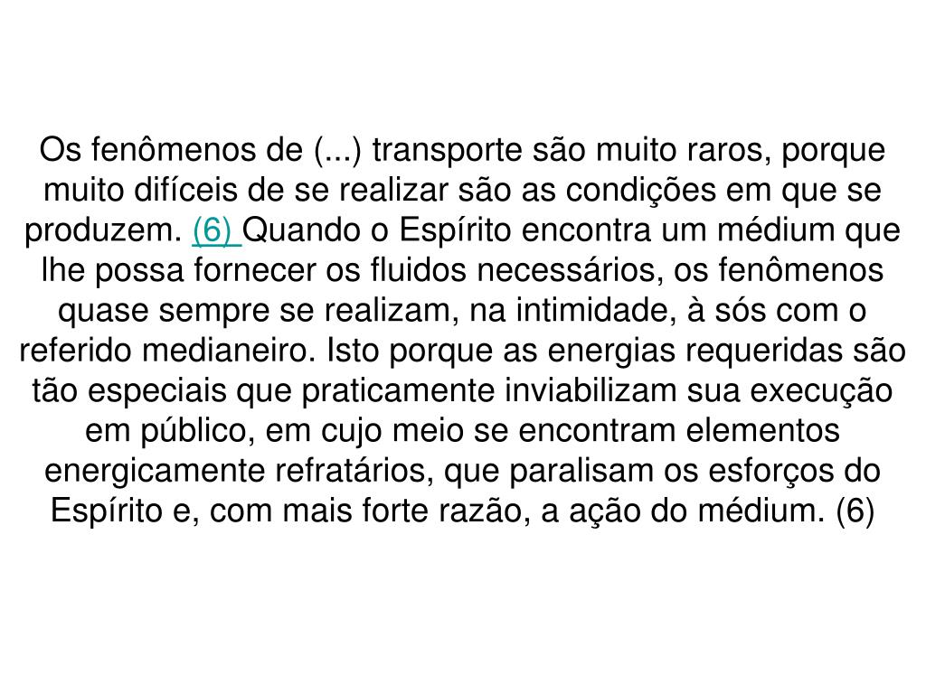 Os fenômenos de (...) transporte são muito raros, porque muito difíceis de se realizar são as condições em que se produzem. (6) Quando o Espírito encontra um médium que lhe possa fornecer os fluidos necessários, os fenômenos quase sempre se realizam, na intimidade, à sós com o referido medianeiro. Isto porque as energias requeridas são tão especiais que praticamente inviabilizam sua execução em público, em cujo meio se encontram elementos energicamente refratários, que paralisam os esforços do Espírito e, com mais forte razão, a ação do médium. (6)