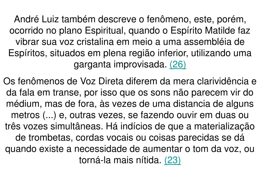 André Luiz também descreve o fenômeno, este, porém, ocorrido no plano Espiritual, quando o Espírito Matilde faz vibrar sua voz cristalina em meio a uma assembléia de Espíritos, situados em plena região inferior, utilizando uma garganta improvisada. (26) Os fenômenos de Voz Direta diferem da mera clarividência e da fala em transe, por isso que os sons não parecem vir do médium, mas de fora, às vezes de uma distancia de alguns metros (...) e, outras vezes, se fazendo ouvir em duas ou três vozes simultâneas. Há indícios de que a materialização de trombetas, cordas vocais ou coisas parecidas se dá quando existe a necessidade de aumentar o tom da voz, ou torná-la mais nítida. (23)