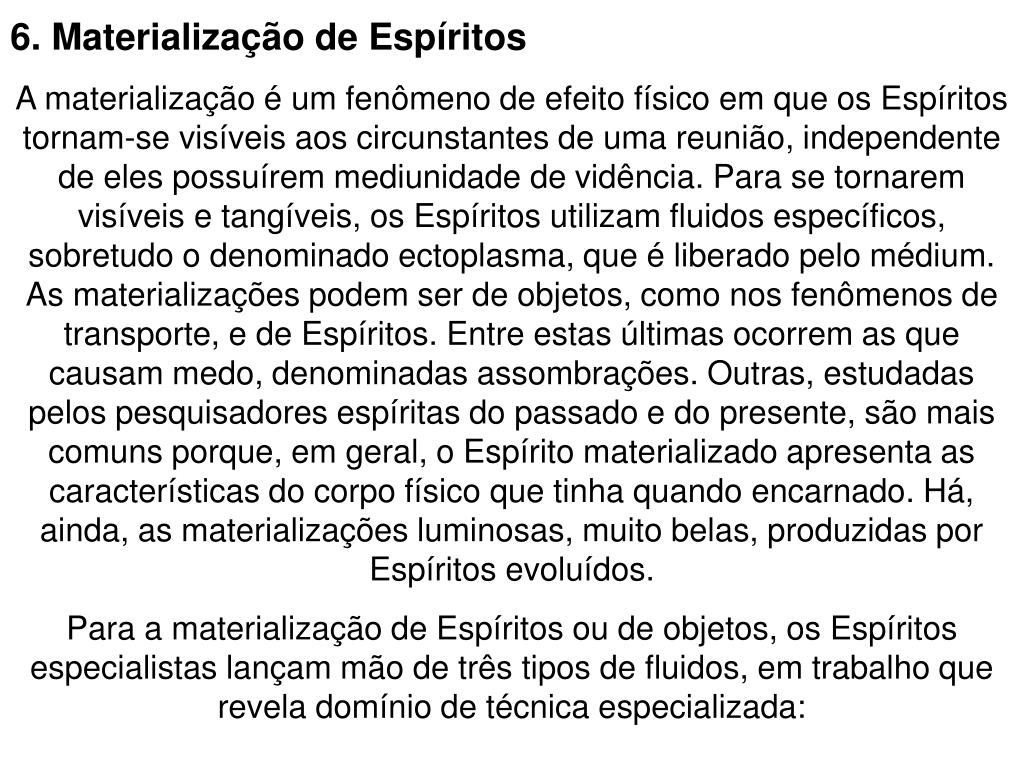 6. Materialização de Espíritos A materialização é um fenômeno de efeito físico em que os Espíritos tornam-se visíveis aos circunstantes de uma reunião, independente de eles possuírem mediunidade de vidência. Para se tornarem visíveis e tangíveis, os Espíritos utilizam fluidos específicos, sobretudo o denominado ectoplasma, que é liberado pelo médium. As materializações podem ser de objetos, como nos fenômenos de transporte, e de Espíritos. Entre estas últimas ocorrem as que causam medo, denominadas assombrações. Outras, estudadas pelos pesquisadores espíritas do passado e do presente, são mais comuns porque, em geral, o Espírito materializado apresenta as características do corpo físico que tinha quando encarnado. Há, ainda, as materializações luminosas, muito belas, produzidas por Espíritos evoluídos. Para a materialização de Espíritos ou de objetos, os Espíritos especialistas lançam mão de três tipos de fluidos, em trabalho que revela domínio de técnica especializada: