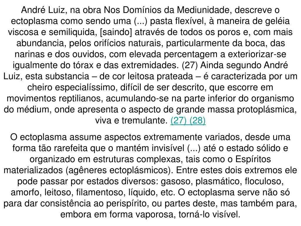 André Luiz, na obra Nos Domínios da Mediunidade, descreve o ectoplasma como sendo uma (...) pasta flexível, à maneira de geléia viscosa e semiliquida, [saindo] através de todos os poros e, com mais abundancia, pelos orifícios naturais, particularmente da boca, das narinas e dos ouvidos, com elevada percentagem a exteriorizar-se igualmente do tórax e das extremidades. (27) Ainda segundo André Luiz, esta substancia – de cor leitosa prateada – é caracterizada por um cheiro especialíssimo, difícil de ser descrito, que escorre em movimentos reptilianos, acumulando-se na parte inferior do organismo do médium, onde apresenta o aspecto de grande massa protoplásmica, viva e tremulante. (27) (28) O ectoplasma assume aspectos extremamente variados, desde uma forma tão rarefeita que o mantém invisível (...) até o estado sólido e organizado em estruturas complexas, tais como o Espíritos materializados (agêneres ectoplásmicos). Entre estes dois extremos ele pode passar por estados diversos: gasoso, plasmático, floculoso, amorfo, leitoso, filamentoso, líquido, etc. O ectoplasma serve não só para dar consistência ao perispírito, ou partes deste, mas também para, embora em forma vaporosa, torná-lo visível.
