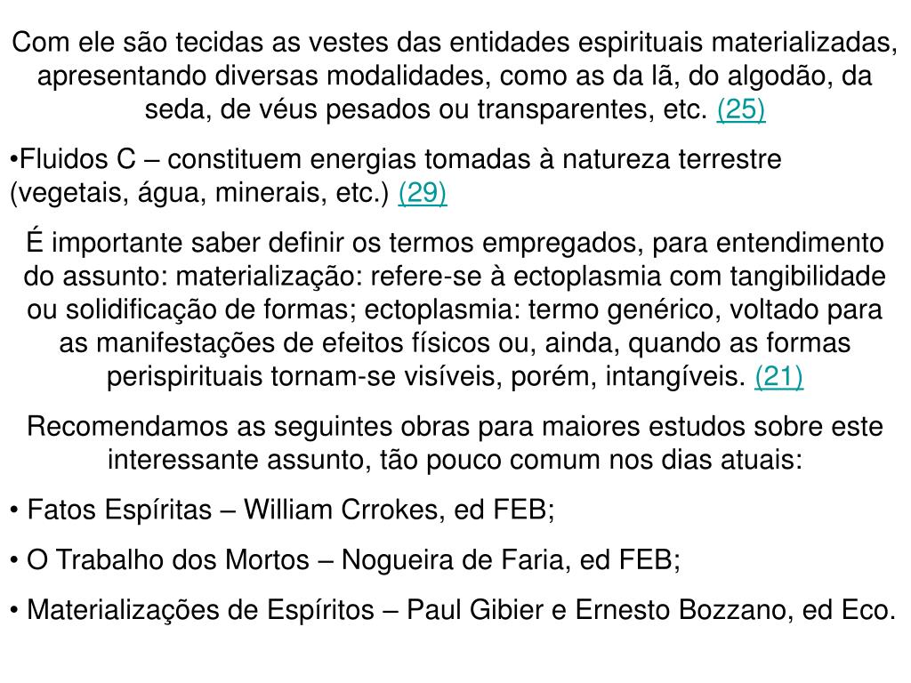 Com ele são tecidas as vestes das entidades espirituais materializadas, apresentando diversas modalidades, como as da lã, do algodão, da seda, de véus pesados ou transparentes, etc. (25) • Fluidos C – constituem energias tomadas à natureza terrestre (vegetais, água, minerais, etc.) (29) • É importante saber definir os termos empregados, para entendimento do assunto: materialização: refere-se à ectoplasmia com tangibilidade ou solidificação de formas; ectoplasmia: termo genérico, voltado para as manifestações de efeitos físicos ou, ainda, quando as formas perispirituais tornam-se visíveis, porém, intangíveis. (21) • Recomendamos as seguintes obras para maiores estudos sobre este interessante assunto, tão pouco comum nos dias atuais: • Fatos Espíritas – William Crrokes, ed FEB; • O Trabalho dos Mortos – Nogueira de Faria, ed FEB; • Materializações de Espíritos – Paul Gibier e Ernesto Bozzano, ed Eco.