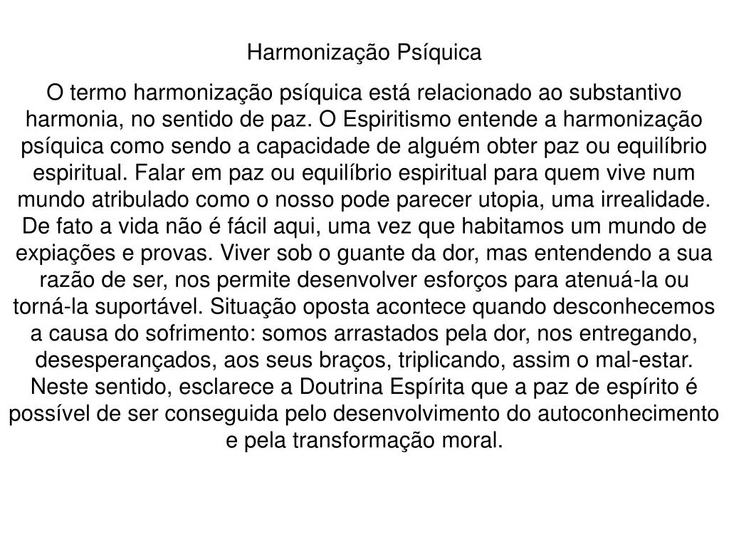 Harmonização Psíquica O termo harmonização psíquica está relacionado ao substantivo harmonia, no sentido de paz. O Espiritismo entende a harmonização psíquica como sendo a capacidade de alguém obter paz ou equilíbrio espiritual. Falar em paz ou equilíbrio espiritual para quem vive num mundo atribulado como o nosso pode parecer utopia, uma irrealidade. De fato a vida não é fácil aqui, uma vez que habitamos um mundo de expiações e provas. Viver sob o guante da dor, mas entendendo a sua razão de ser, nos permite desenvolver esforços para atenuá-la ou torná-la suportável. Situação oposta acontece quando desconhecemos a causa do sofrimento: somos arrastados pela dor, nos entregando, desesperançados, aos seus braços, triplicando, assim o mal-estar. Neste sentido, esclarece a Doutrina Espírita que a paz de espírito é possível de ser conseguida pelo desenvolvimento do autoconhecimento e pela transformação moral.