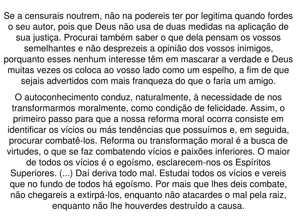 Se a censurais noutrem, não na podereis ter por legitima quando fordes o seu autor, pois que Deus não usa de duas medidas na aplicação de sua justiça. Procurai também saber o que dela pensam os vossos semelhantes e não desprezeis a opinião dos vossos inimigos, porquanto esses nenhum interesse têm em mascarar a verdade e Deus muitas vezes os coloca ao vosso lado como um espelho, a fim de que sejais advertidos com mais franqueza do que o faria um amigo. O autoconhecimento conduz, naturalmente, à necessidade de nos transformarmos moralmente, como condição de felicidade. Assim, o primeiro passo para que a nossa reforma moral ocorra consiste em identificar os vícios ou más tendências que possuímos e, em seguida, procurar combatê-los. Reforma ou transformação moral é a busca de virtudes, o que se faz combatendo vícios e paixões inferiores. O maior de todos os vícios é o egoísmo, esclarecem-nos os Espíritos Superiores. (...) Daí deriva todo mal. Estudai todos os vícios e vereis que no fundo de todos há egoísmo. Por mais que lhes deis combate, não chegareis a extirpá-los, enquanto não atacardes o mal pela raiz, enquanto não lhe houverdes destruído a causa.
