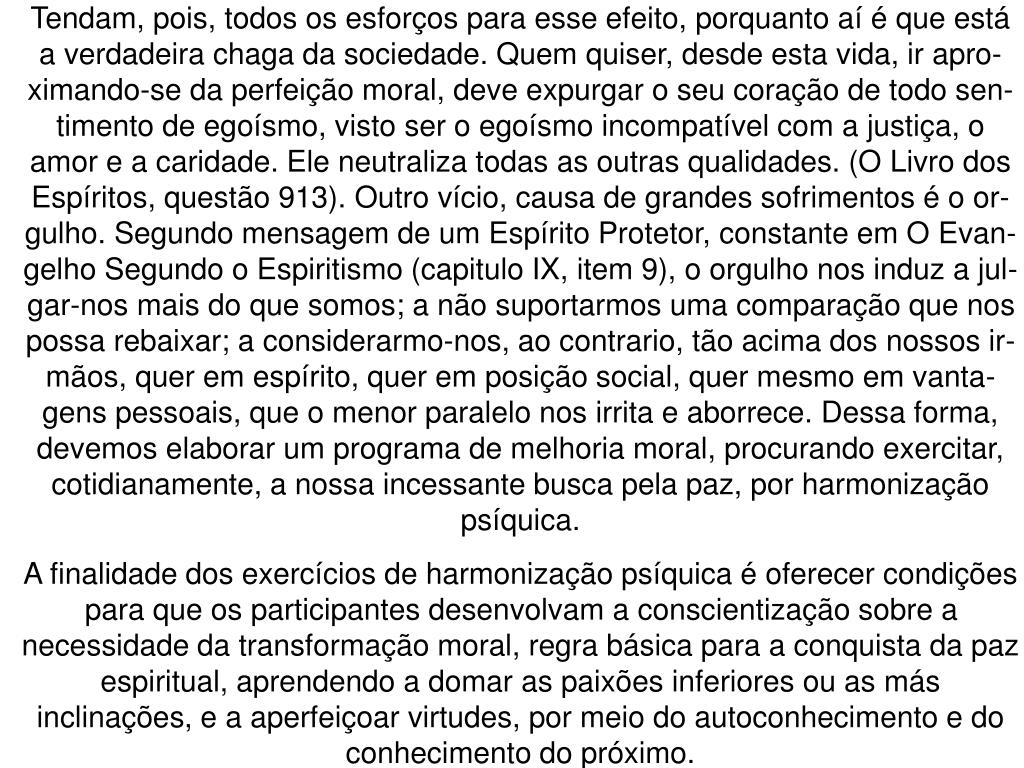 Tendam, pois, todos os esforços para esse efeito, porquanto aí é que está a verdadeira chaga da sociedade. Quem quiser, desde esta vida, ir apro-ximando-se da perfeição moral, deve expurgar o seu coração de todo sen-timento de egoísmo, visto ser o egoísmo incompatível com a justiça, o amor e a caridade. Ele neutraliza todas as outras qualidades. (O Livro dos Espíritos, questão 913). Outro vício, causa de grandes sofrimentos é o or-gulho. Segundo mensagem de um Espírito Protetor, constante em O Evan-gelho Segundo o Espiritismo (capitulo IX, item 9), o orgulho nos induz a jul-gar-nos mais do que somos; a não suportarmos uma comparação que nos possa rebaixar; a considerarmo-nos, ao contrario, tão acima dos nossos ir-mãos, quer em espírito, quer em posição social, quer mesmo em vanta-gens pessoais, que o menor paralelo nos irrita e aborrece. Dessa forma, devemos elaborar um programa de melhoria moral, procurando exercitar, cotidianamente, a nossa incessante busca pela paz, por harmonização psíquica. A finalidade dos exercícios de harmonização psíquica é oferecer condições para que os participantes desenvolvam a conscientização sobre a necessidade da transformação moral, regra básica para a conquista da paz espiritual, aprendendo a domar as paixões inferiores ou as más inclinações, e a aperfeiçoar virtudes, por meio do autoconhecimento e do conhecimento do próximo.