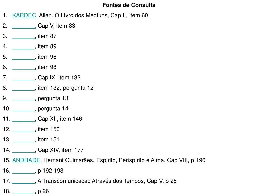 Fontes de Consulta • KARDEC, Allan. O Livro dos Médiuns, Cap II, item 60 • _______, Cap V, item 83 • _______, item 87 • _______, item 89 • _______, item 96 • _______, item 98 • _______, Cap IX, item 132 • _______, item 132, pergunta 12 • _______, pergunta 13 • _______, pergunta 14 • _______, Cap XII, item 146 • _______, item 150 • _______, item 151 • _______, Cap XIV, item 177 • ANDRADE, Hernani Guimarães. Espírito, Perispírito e Alma. Cap VIII, p 190 • _______, p 192-193 • _______, A Transcomunicação Através dos Tempos, Cap V, p 25 • _______, p 26
