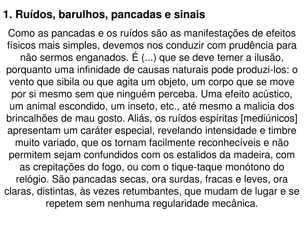 1. Ruídos, barulhos, pancadas e sinais Como as pancadas e os ruídos são as manifestações de efeitos físicos mais simples, devemos nos conduzir com prudência para não sermos enganados. É (...) que se deve temer a ilusão, porquanto uma infinidade de causas naturais pode produzi-los: o vento que sibila ou que agita um objeto, um corpo que se move por si mesmo sem que ninguém perceba. Uma efeito acústico, um animal escondido, um inseto, etc., até mesmo a malicia dos brincalhões de mau gosto. Aliás, os ruídos espíritas [mediúnicos] apresentam um caráter especial, revelando intensidade e timbre muito variado, que os tornam facilmente reconhecíveis e não permitem sejam confundidos com os estalidos da madeira, com as crepitações do fogo, ou com o tique-taque monótono do relógio. São pancadas secas, ora surdas, fracas e leves, ora claras, distintas, às vezes retumbantes, que mudam de lugar e se repetem sem nenhuma regularidade mecânica.