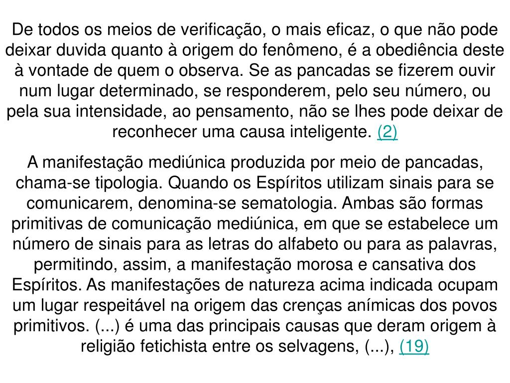 De todos os meios de verificação, o mais eficaz, o que não pode deixar duvida quanto à origem do fenômeno, é a obediência deste à vontade de quem o observa. Se as pancadas se fizerem ouvir num lugar determinado, se responderem, pelo seu número, ou pela sua intensidade, ao pensamento, não se lhes pode deixar de reconhecer uma causa inteligente. (2) A manifestação mediúnica produzida por meio de pancadas, chama-se tipologia. Quando os Espíritos utilizam sinais para se comunicarem, denomina-se sematologia. Ambas são formas primitivas de comunicação mediúnica, em que se estabelece um número de sinais para as letras do alfabeto ou para as palavras, permitindo, assim, a manifestação morosa e cansativa dos Espíritos. As manifestações de natureza acima indicada ocupam um lugar respeitável na origem das crenças anímicas dos povos primitivos. (...) é uma das principais causas que deram origem à religião fetichista entre os selvagens, (...), (19)
