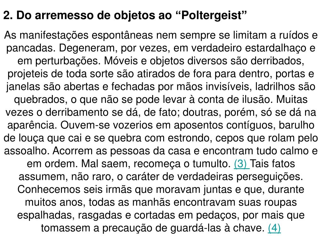 2. Do arremesso de objetos ao “Poltergeist” As manifestações espontâneas nem sempre se limitam a ruídos e pancadas. Degeneram, por vezes, em verdadeiro estardalhaço e em perturbações. Móveis e objetos diversos são derribados, projeteis de toda sorte são atirados de fora para dentro, portas e janelas são abertas e fechadas por mãos invisíveis, ladrilhos são quebrados, o que não se pode levar à conta de ilusão. Muitas vezes o derribamento se dá, de fato; doutras, porém, só se dá na aparência. Ouvem-se vozerios em aposentos contíguos, barulho de louça que cai e se quebra com estrondo, cepos que rolam pelo assoalho. Acorrem as pessoas da casa e encontram tudo calmo e em ordem. Mal saem, recomeça o tumulto. (3) Tais fatos assumem, não raro, o caráter de verdadeiras perseguições. Conhecemos seis irmãs que moravam juntas e que, durante muitos anos, todas as manhãs encontravam suas roupas espalhadas, rasgadas e cortadas em pedaços, por mais que tomassem a precaução de guardá-las à chave. (4)