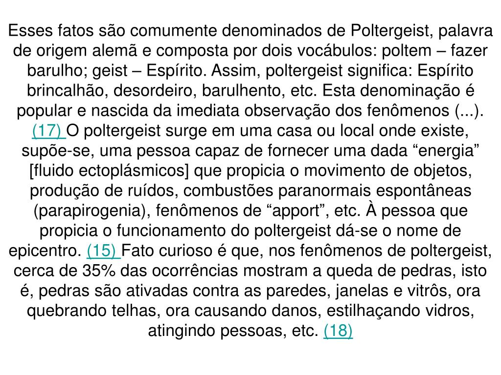 Esses fatos são comumente denominados de Poltergeist, palavra de origem alemã e composta por dois vocábulos: poltem – fazer barulho; geist – Espírito. Assim, poltergeist significa: Espírito brincalhão, desordeiro, barulhento, etc. Esta denominação é popular e nascida da imediata observação dos fenômenos (...). (17) O poltergeist surge em uma casa ou local onde existe, supõe-se, uma pessoa capaz de fornecer uma dada “energia” [fluido ectoplásmicos] que propicia o movimento de objetos, produção de ruídos, combustões paranormais espontâneas (parapirogenia), fenômenos de “apport”, etc. À pessoa que propicia o funcionamento do poltergeist dá-se o nome de epicentro. (15) Fato curioso é que, nos fenômenos de poltergeist, cerca de 35% das ocorrências mostram a queda de pedras, isto é, pedras são ativadas contra as paredes, janelas e vitrôs, ora quebrando telhas, ora causando danos, estilhaçando vidros, atingindo pessoas, etc. (18)