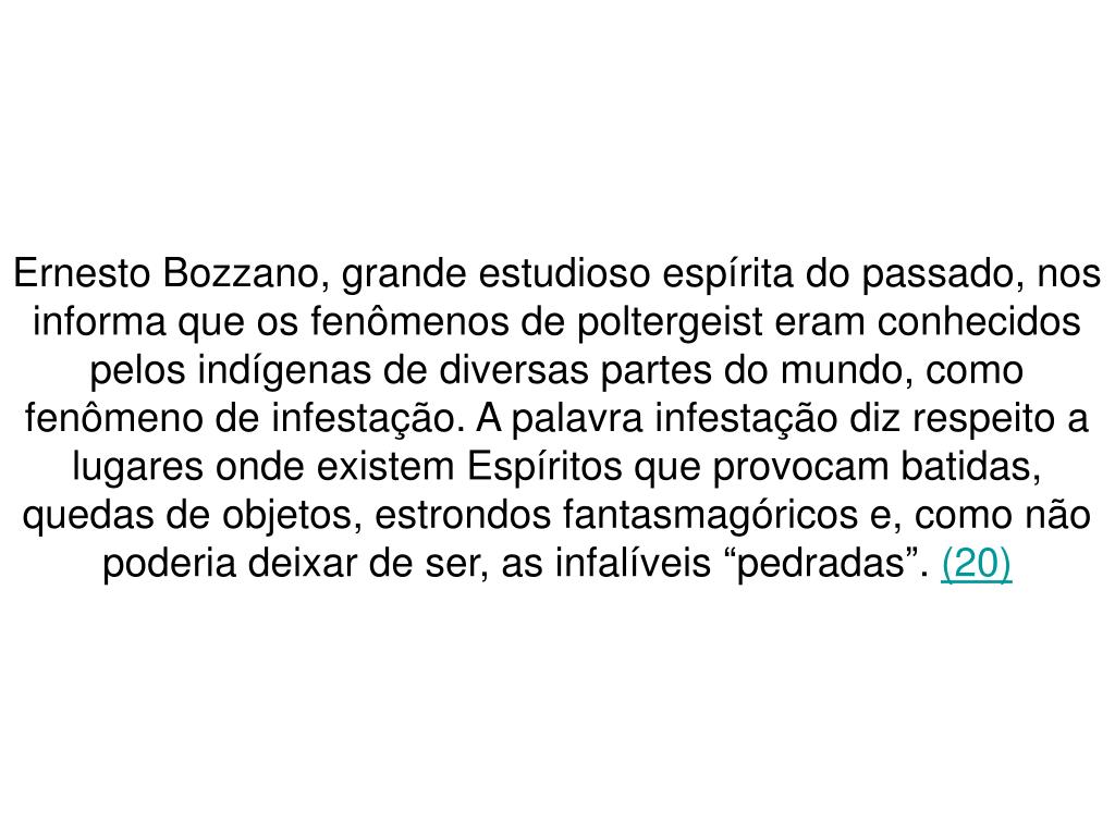 Ernesto Bozzano, grande estudioso espírita do passado, nos informa que os fenômenos de poltergeist eram conhecidos pelos indígenas de diversas partes do mundo, como fenômeno de infestação. A palavra infestação diz respeito a lugares onde existem Espíritos que provocam batidas, quedas de objetos, estrondos fantasmagóricos e, como não poderia deixar de ser, as infalíveis “pedradas”. (20)