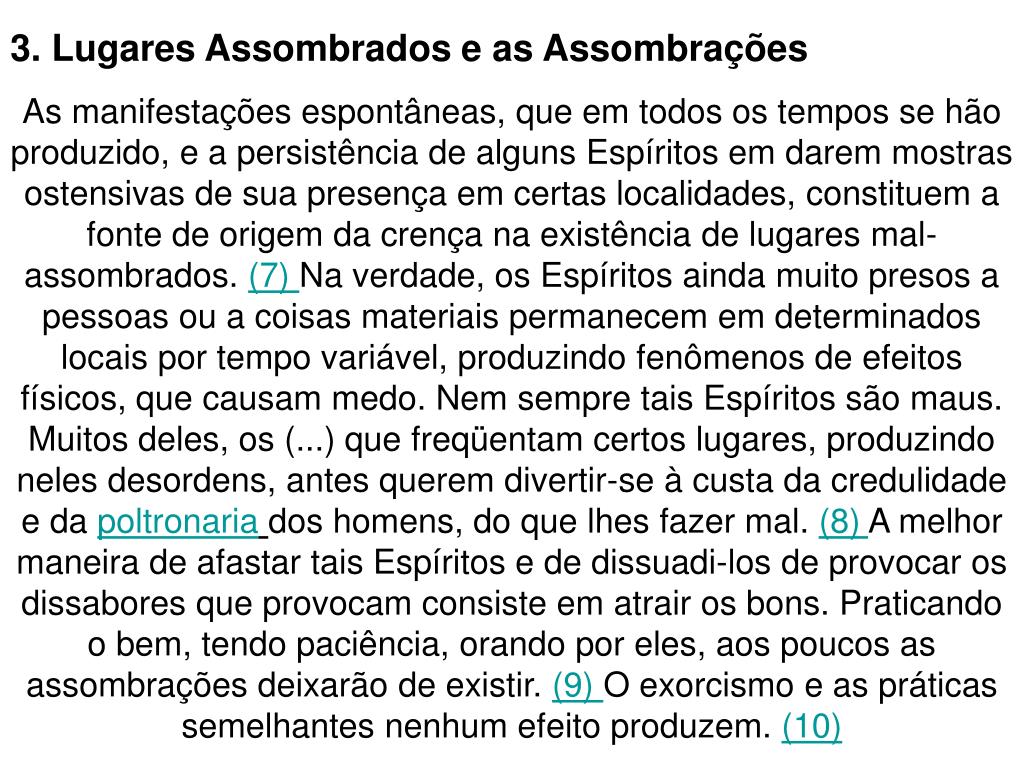3. Lugares Assombrados e as Assombrações As manifestações espontâneas, que em todos os tempos se hão produzido, e a persistência de alguns Espíritos em darem mostras ostensivas de sua presença em certas localidades, constituem a fonte de origem da crença na existência de lugares mal-assombrados. (7) Na verdade, os Espíritos ainda muito presos a pessoas ou a coisas materiais permanecem em determinados locais por tempo variável, produzindo fenômenos de efeitos físicos, que causam medo. Nem sempre tais Espíritos são maus. Muitos deles, os (...) que freqüentam certos lugares, produzindo neles desordens, antes querem divertir-se à custa da credulidade e da poltronariados homens, do que lhes fazer mal. (8) A melhor maneira de afastar tais Espíritos e de dissuadi-los de provocar os dissabores que provocam consiste em atrair os bons. Praticando o bem, tendo paciência, orando por eles, aos poucos as assombrações deixarão de existir. (9) O exorcismo e as práticas semelhantes nenhum efeito produzem. (10)