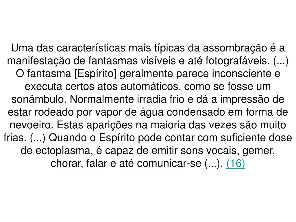 Uma das características mais típicas da assombração é a manifestação de fantasmas visíveis e até fotografáveis. (...) O fantasma [Espírito] geralmente parece inconsciente e executa certos atos automáticos, como se fosse um sonâmbulo. Normalmente irradia frio e dá a impressão de estar rodeado por vapor de água condensado em forma de nevoeiro. Estas aparições na maioria das vezes são muito frias. (...) Quando o Espírito pode contar com suficiente dose de ectoplasma, é capaz de emitir sons vocais, gemer, chorar, falar e até comunicar-se (...). (16)