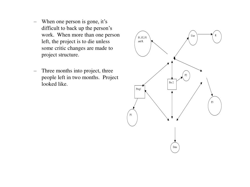 When one person is gone, it’s difficult to back up the person’s work. When more than one person left, the project is to die unless some critic changes are made to project structure. • Three months into project, three people left in two months. Project looked like.