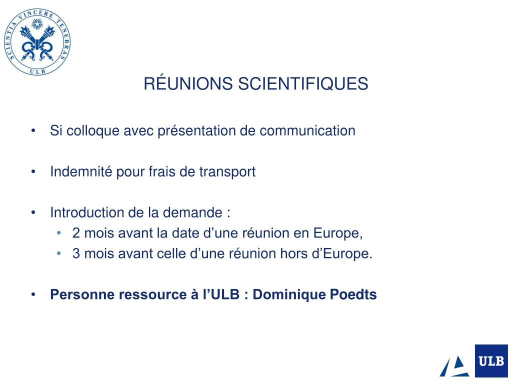RÉUNIONS SCIENTIFIQUES • Si colloque avec présentation de communication • Indemnité pour frais de transport • Introduction de la demande : • 2 mois avant la date d’une réunion en Europe, • 3 mois avant celle d’une réunion hors d’Europe. • Personne ressource à l’ULB : Dominique Poedts