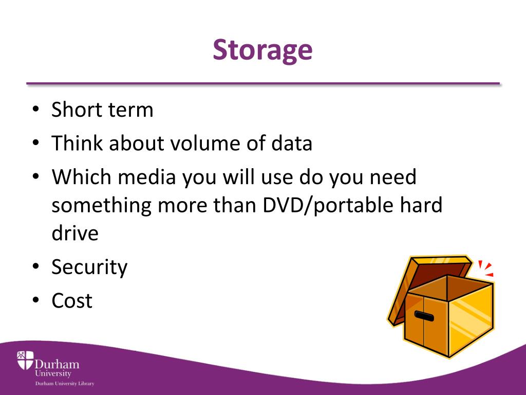 Storage • Short term • Think about volume of data • Which media you will use do you need something more than DVD/portable hard drive • Security • Cost