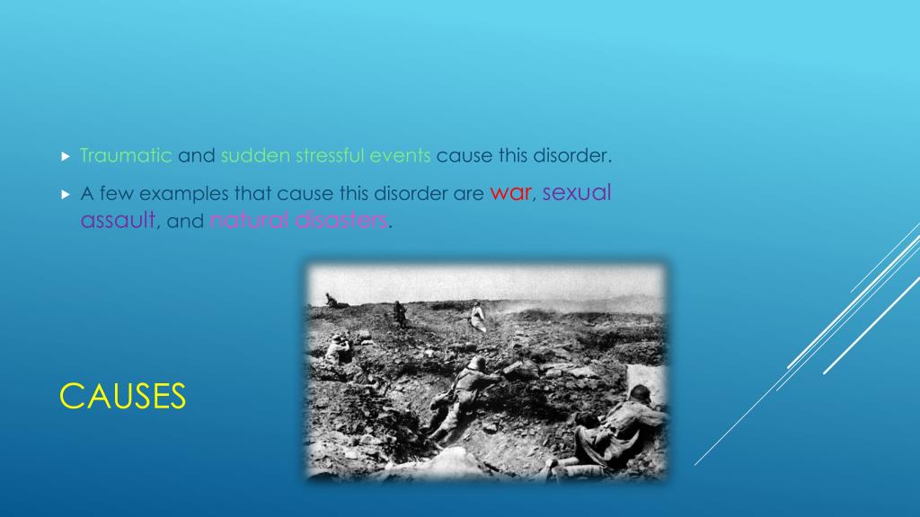 Traumatic and sudden stressful events cause this disorder. • A few examples that cause this disorder are war, sexual assault, and natural disasters. Causes