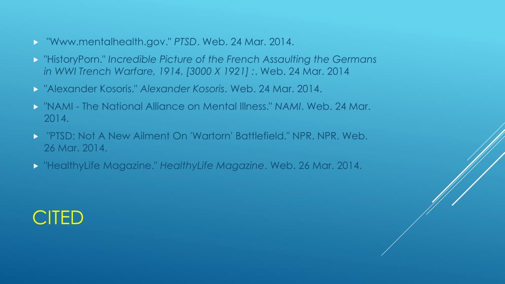 "Www.mentalhealth.gov." PTSD. Web. 24 Mar. 2014. • "HistoryPorn." Incredible Picture of the French Assaulting the Germans in WWI Trench Warfare, 1914. [3000 X 1921] :. Web. 24 Mar. 2014 • "Alexander Kosoris." Alexander Kosoris. Web. 24 Mar. 2014. • "NAMI - The National Alliance on Mental Illness." NAMI. Web. 24 Mar. 2014. • "PTSD: Not A New Ailment On 'Wartorn' Battlefield." NPR. NPR. Web. 26 Mar. 2014. • "HealthyLife Magazine." HealthyLife Magazine. Web. 26 Mar. 2014. Cited