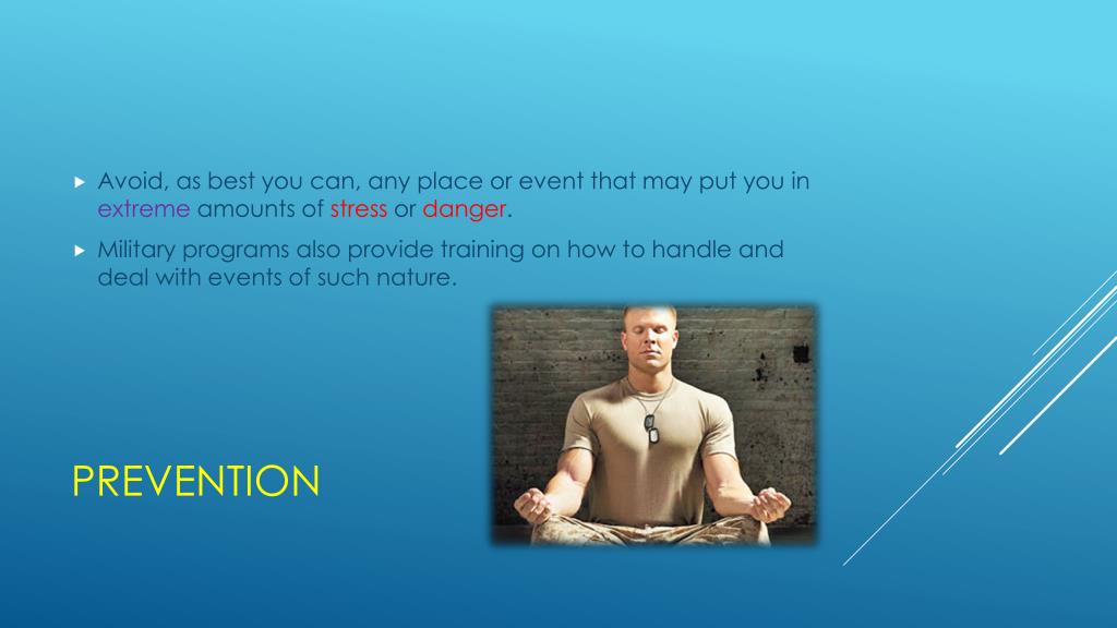 Avoid, as best you can, any place or event that may put you in extreme amounts of stress or danger. • Military programs also provide training on how to handle and deal with events of such nature. Prevention