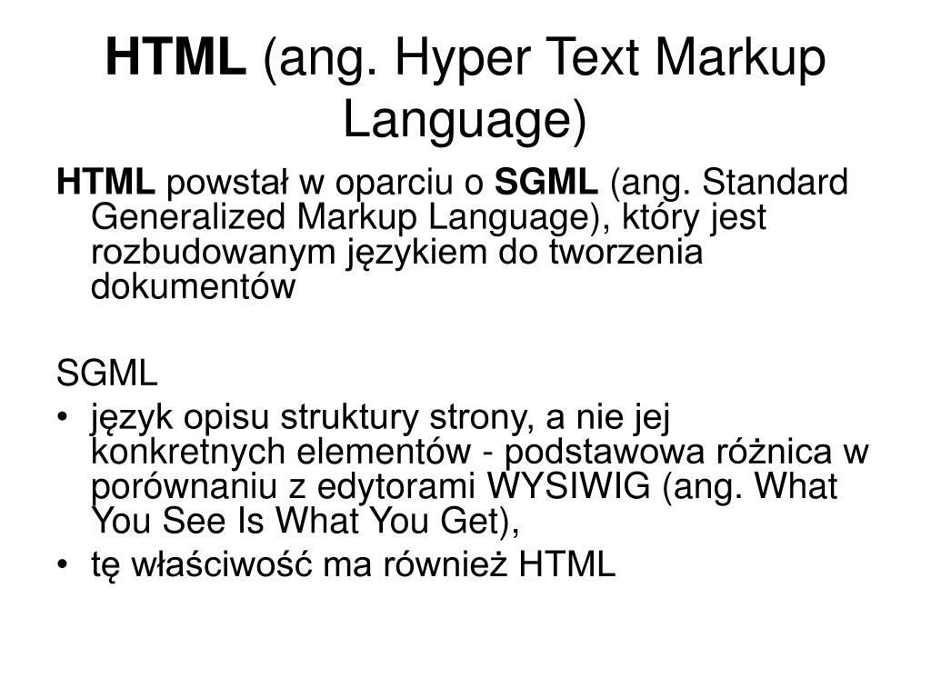 HTML (ang.Hyper Text Markup Language) HTML powstałw oparciu o SGML (ang. Standard Generalized Markup Language), który jest rozbudowanym językiem do tworzenia dokumentów SGML • język opisu struktury strony, a nie jej konkretnych elementów - podstawowa różnica w porównaniu z edytorami WYSIWIG (ang. What You See Is What You Get), • tę właściwość ma również HTML