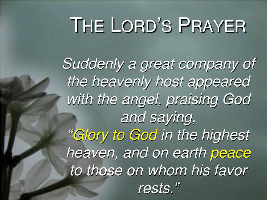 The Lord’s Prayer Suddenly a great company of the heavenly host appeared with the angel, praising God and saying, “Glory to God in the highest heaven, and on earth peace to those on whom his favor rests.” Luke 2:13-14