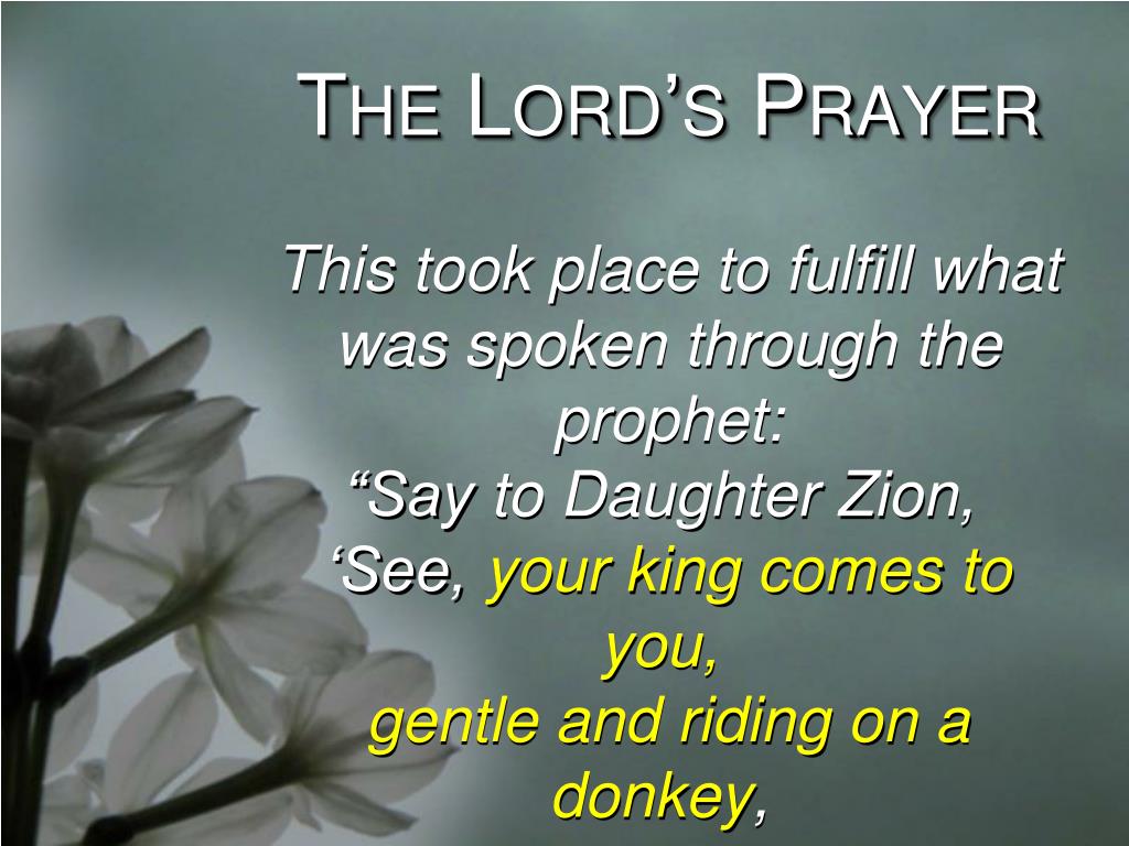 The Lord’s Prayer This took place to fulfill what was spoken through the prophet: “Say to Daughter Zion, ‘See, your king comes to you, gentle and riding on a donkey, and on a colt, the foal of a donkey.’” Matthew 21:4-5