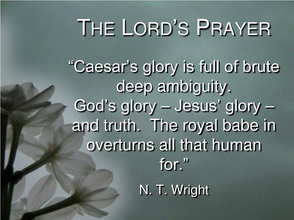 The Lord’s Prayer “Caesar’s glory is full of brute force and deep ambiguity. God’s glory – Jesus’ glory – is full of grace and truth. The royal babe in the cow-shed overturns all that human empire stands for.” N. T. Wright