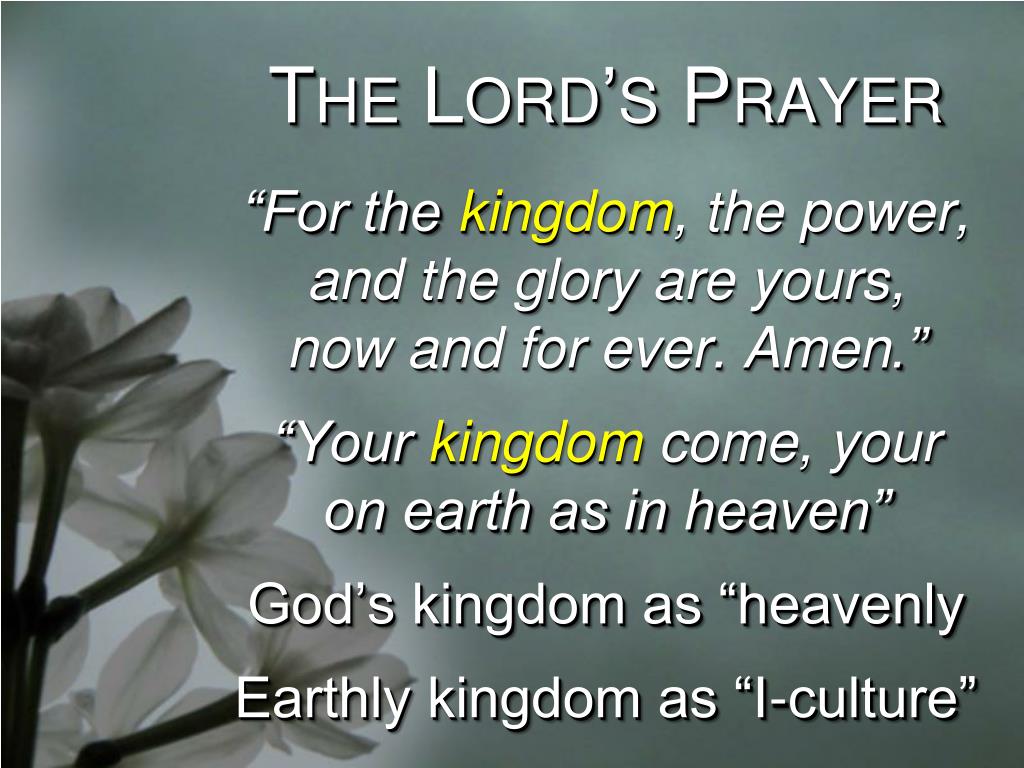 The Lord’s Prayer “For the kingdom, the power,and the glory are yours,now and for ever. Amen.” “Your kingdom come, your will be done, on earth as in heaven” God’s kingdom as “heavenly culture” Earthly kingdom as “I-culture”