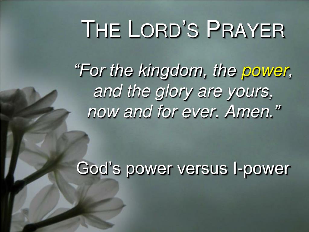 The Lord’s Prayer “For the kingdom, the power,and the glory are yours,now and for ever. Amen.” God’s power versus I-power