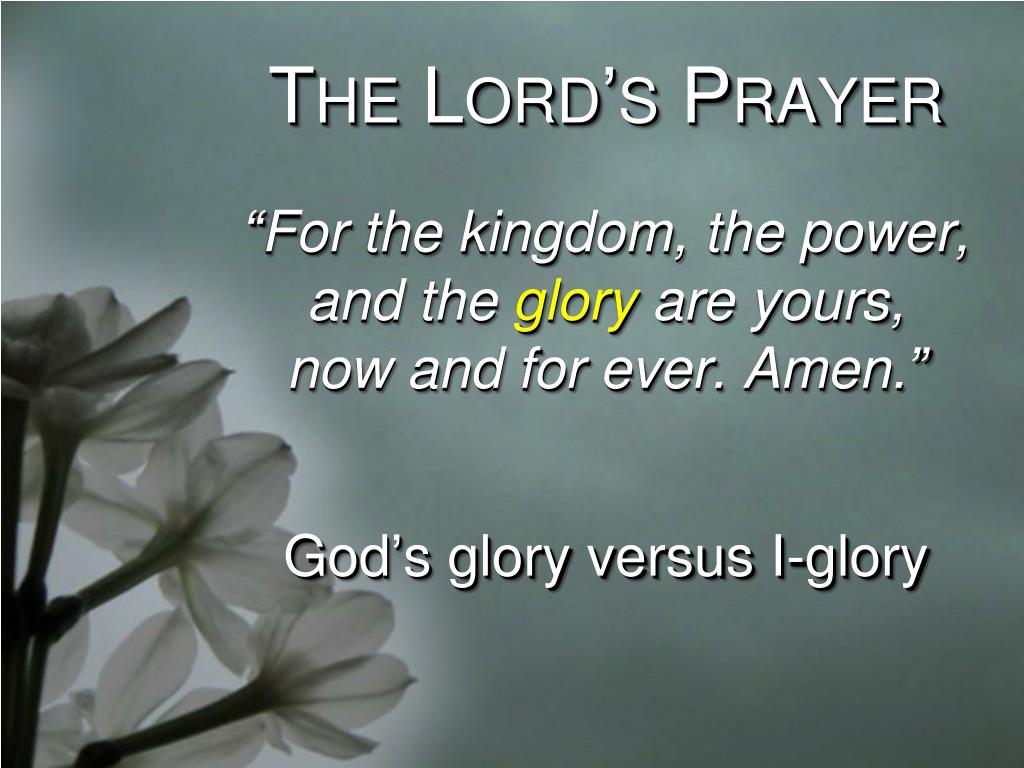 The Lord’s Prayer “For the kingdom, the power,and the glory are yours,now and for ever. Amen.” God’s glory versus I-glory