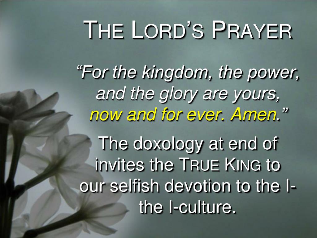 The Lord’s Prayer “For the kingdom, the power,and the glory are yours,now and for ever. Amen.” The doxology at end of Lord’s Prayer invites the True King to expose and heal our selfish devotion to the I-kingdom and the I-culture.