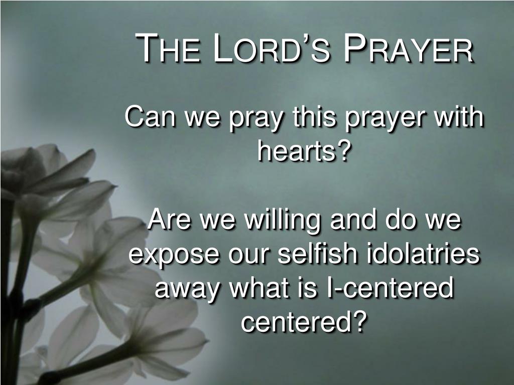 The Lord’s Prayer Can we pray this prayer with soft, open hearts? Are we willing and do we desire for God to expose our selfish idolatries and to burn away what is I-centered rather than Thou-centered?