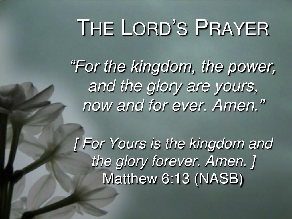 The Lord’s Prayer Lent 2011. The Lord’s Prayer “For the kingdom, the power, and the glory are yours, now and for ever. Amen .” [ For Yours is the kingdom and the power and the glory forever. Amen . ] Matthew 6:13 (NASB). The Lord’s Prayer