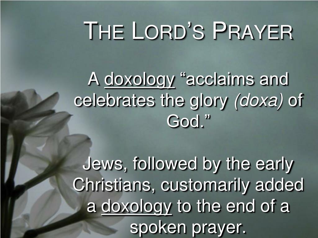 The Lord’s Prayer A doxology “acclaims and celebrates the glory (doxa) of God.” Jews, followed by the early Christians, customarily added a doxology to the end of a spoken prayer.