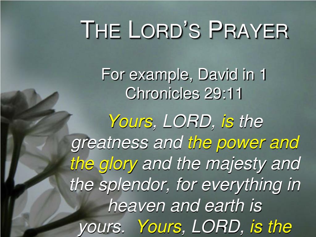 The Lord’s Prayer For example, David in 1 Chronicles 29:11 Yours, LORD, is the greatness and the power and the glory and the majesty and the splendor, for everything in heaven and earth is yours. Yours, LORD, is the kingdom; you are exalted as head over all.