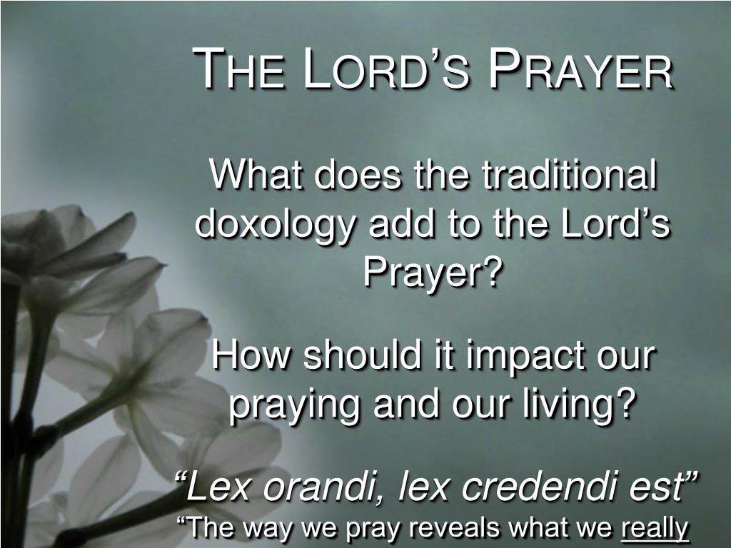 The Lord’s Prayer What does the traditional doxology add to the Lord’s Prayer? How should it impact our praying and our living? “Lexorandi, lexcredendiest” “The way we pray reveals what we really believe”