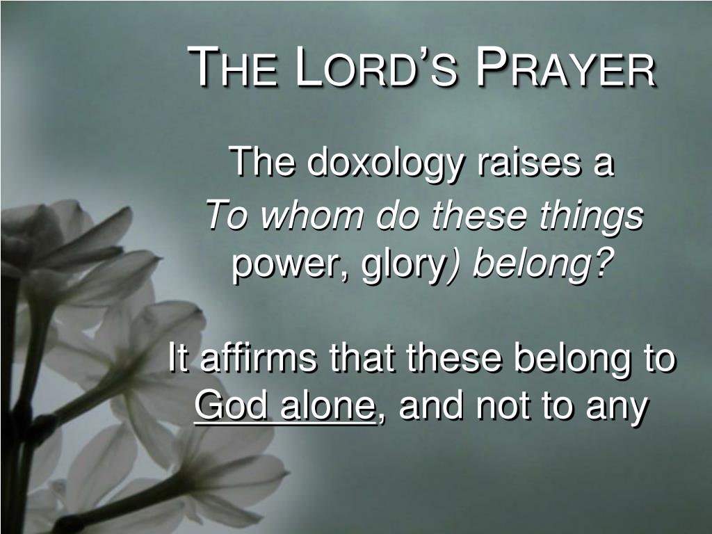 The Lord’s Prayer The doxology raises a question: To whom do these things (kingdom, power, glory) belong? It affirms that these belong to the Triune God alone, and not to any pretenders.