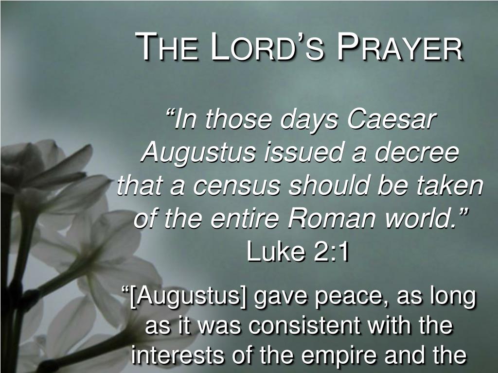 The Lord’s Prayer “In those days Caesar Augustus issued a decree that a census should be taken of the entire Roman world.” Luke 2:1 “[Augustus] gave peace, as long as it was consistent with the interests of the empire and the myth of his own glory.”