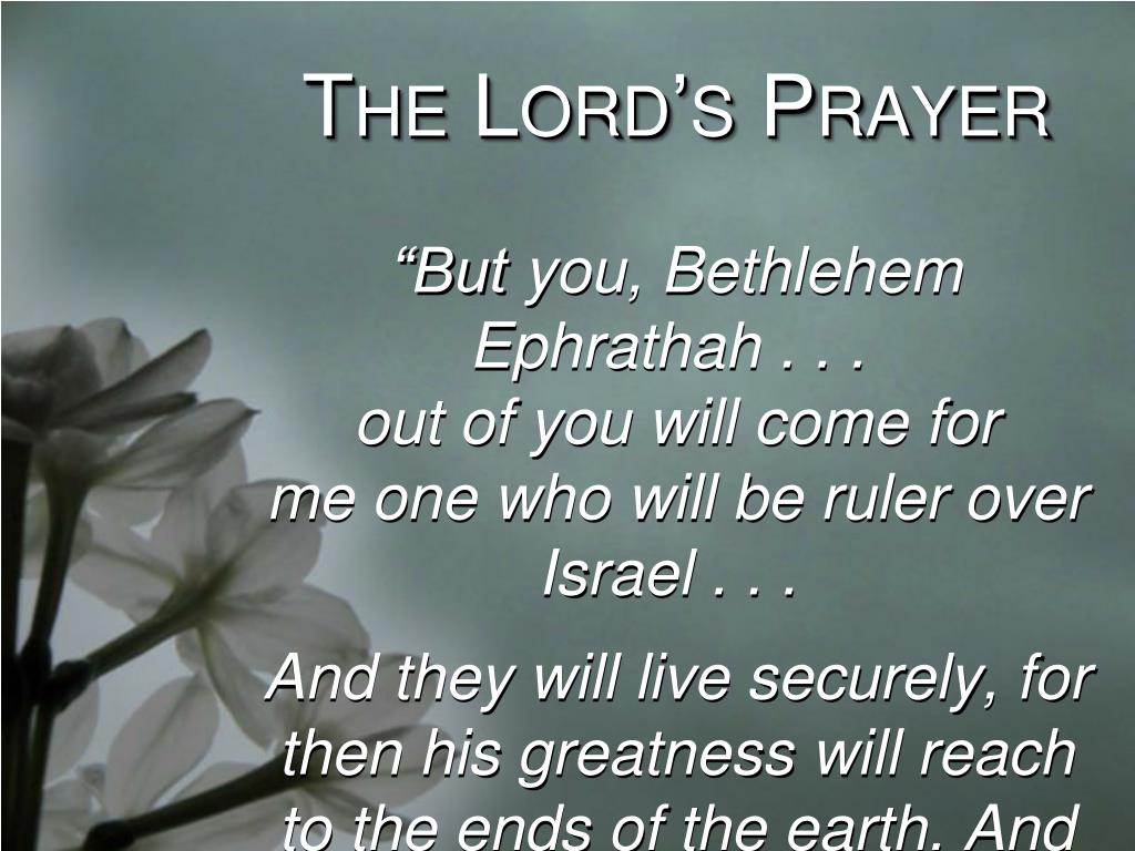 The Lord’s Prayer “But you, Bethlehem Ephrathah . . . out of you will come for me one who will be ruler over Israel . . . And they will live securely, for then his greatness will reach to the ends of the earth. And he will be our peace” Micah 5:2,4-5