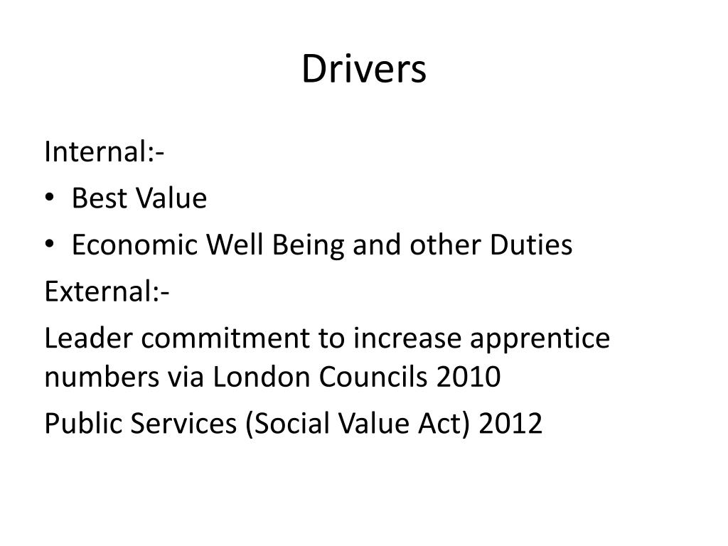 Drivers Internal:- • Best Value • Economic Well Being and other Duties External:- Leader commitment to increase apprentice numbers via London Councils 2010 Public Services (Social Value Act) 2012