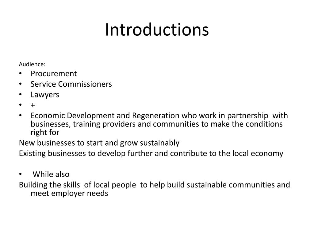 Delivering Economic Benefits . Through Collaborative Procurement. Introductions. Audience: Procurement Service Commissioners Lawyers + Economic Development and Regeneration who work in partnership with businesses, training providers and communities to make the conditions right for