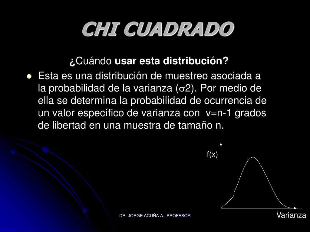 CHI CUADRADO ¿Cuándo usar esta distribución? • Esta es una distribución de muestreo asociada a la probabilidad de la varianza (2). Por medio de ella se determina la probabilidad de ocurrencia de un valor específico de varianza con v=n-1 grados de libertad en una muestra de tamaño n. f(x) Varianza DR. JORGE ACUÑA A., PROFESOR