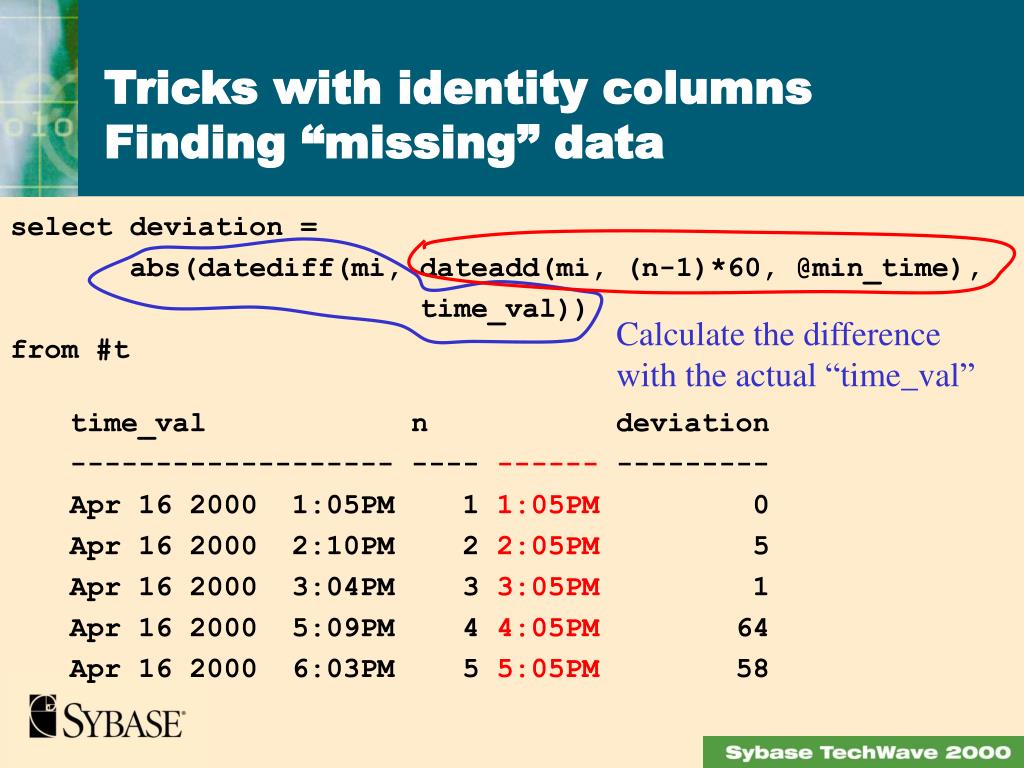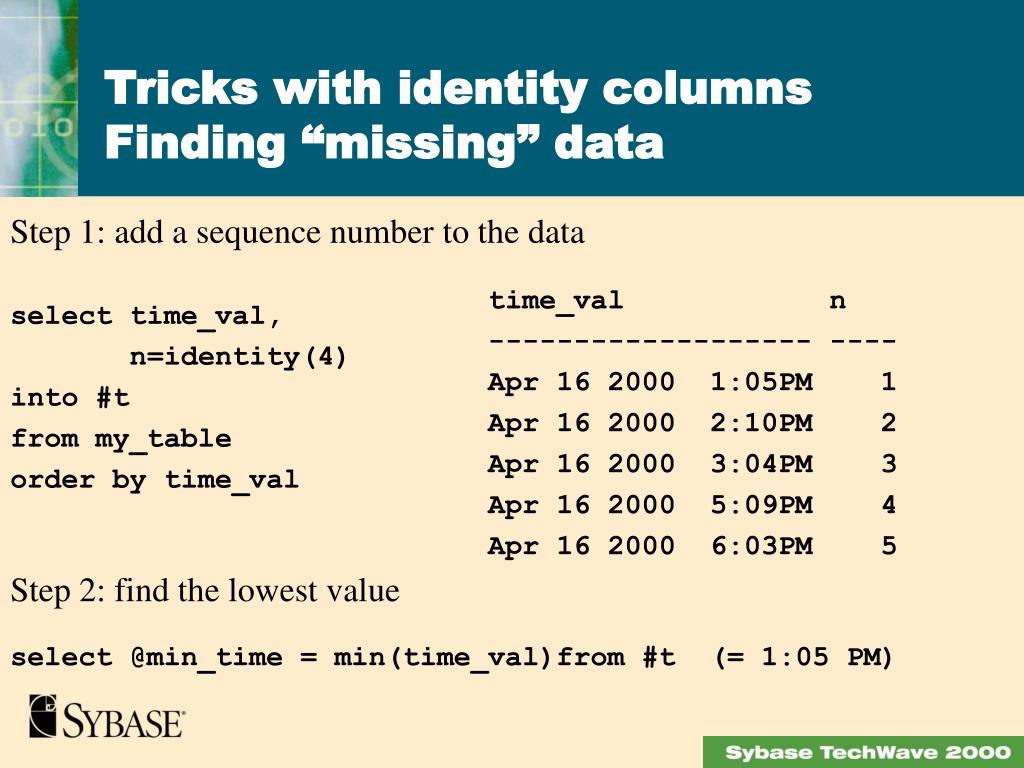 Tricks with identity columnsFinding “missing” data • Example: table “my_tab”: • time_val • ------------------- • Apr 16 2000 1:05PM • Apr 16 2000 2:10PM • Apr 16 2000 3:04PM • Apr 16 2000 5:09PM <== 4 PM row is missing ! • Apr 16 2000 6:03PM