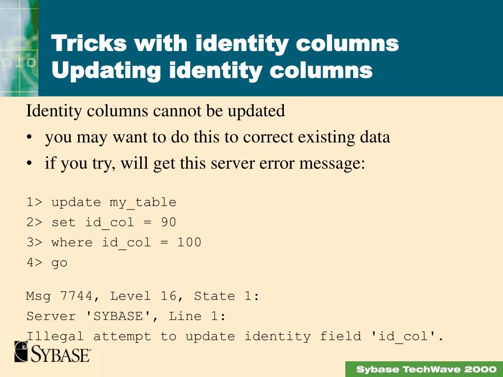 Identity columns cannot be updated you may want to do this to correct existing data if you try, will get this server error message: 1> update my_table 2> set id_col = 90 3> where id_col = 100 4> go Msg 7744, Level 16, State 1: Server 'SYBASE', Line 1: Illegal attempt to update identity field 'id_col'. Tricks with identity columnsUpdating identity columns