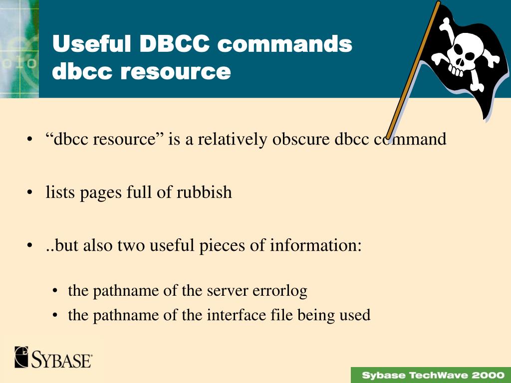 “dbcc resource” is a relatively obscure dbcc command lists pages full of rubbish ..but also two useful pieces of information: the pathname of the server errorlog the pathname of the interface file being used Useful DBCC commandsdbcc resource