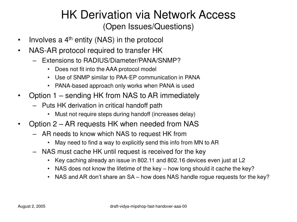 HK Derivation via Network Access(Open Issues/Questions) • Involves a 4th entity (NAS) in the protocol • NAS-AR protocol required to transfer HK • Extensions to RADIUS/Diameter/PANA/SNMP? • Does not fit into the AAA protocol model • Use of SNMP similar to PAA-EP communication in PANA • PANA-based approach only works when PANA is used • Option 1 – sending HK from NAS to AR immediately • Puts HK derivation in critical handoff path • Must not require steps during handoff (increases delay) • Option 2 – AR requests HK when needed from NAS • AR needs to know which NAS to request HK from • May need to find a way to explicitly send this info from MN to AR • NAS must cache HK until request is received for the key • Key caching already an issue in 802.11 and 802.16 devices even just at L2 • NAS does not know the lifetime of the key – how long should it cache the key? • NAS and AR don’t share an SA – how does NAS handle rogue requests for the key? draft-vidya-mipshop-fast-handover-aaa-00
